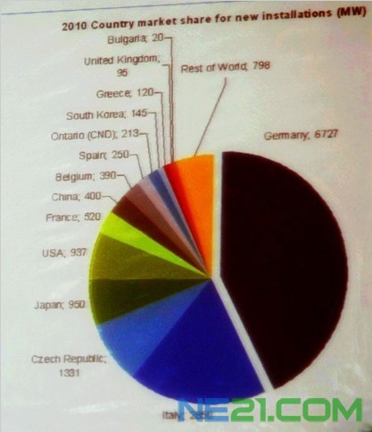 據2011年2月15日iSuppli統計數據顯示,德國裝機量占全球裝機總量近一半,高達6727MW;意大利裝機量居全國第二,總量為2850MW。