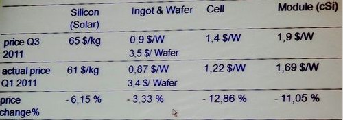 2011年Q3相較同年Q1,太陽能電池價格下降幅度最大,降幅約為12.86%;光伏組件價格降幅為11.05%;晶硅價格預計將下降6.15%;硅錠和硅片價格預計將下降3.33%.