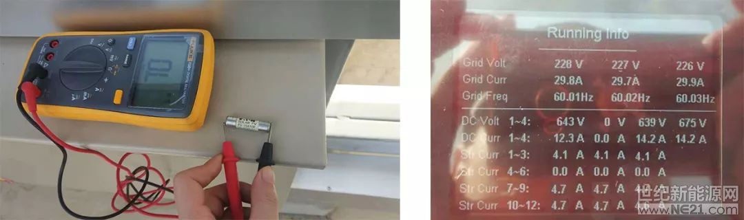 處理結(jié)果:現(xiàn)場(chǎng)查看屏幕,發(fā)現(xiàn)PV2無(wú)電壓,拔開(kāi)端子用萬(wàn)用表檢測(cè)電壓正常,重新插上,DC開(kāi)關(guān)也處于“ON”狀態(tài),打開(kāi)逆變器下蓋,測(cè)得匯流板出去的電壓值為0,最后測(cè)出熔絲處于開(kāi)路狀態(tài) ,更換保險(xiǎn)絲后,逆變器正常工作。