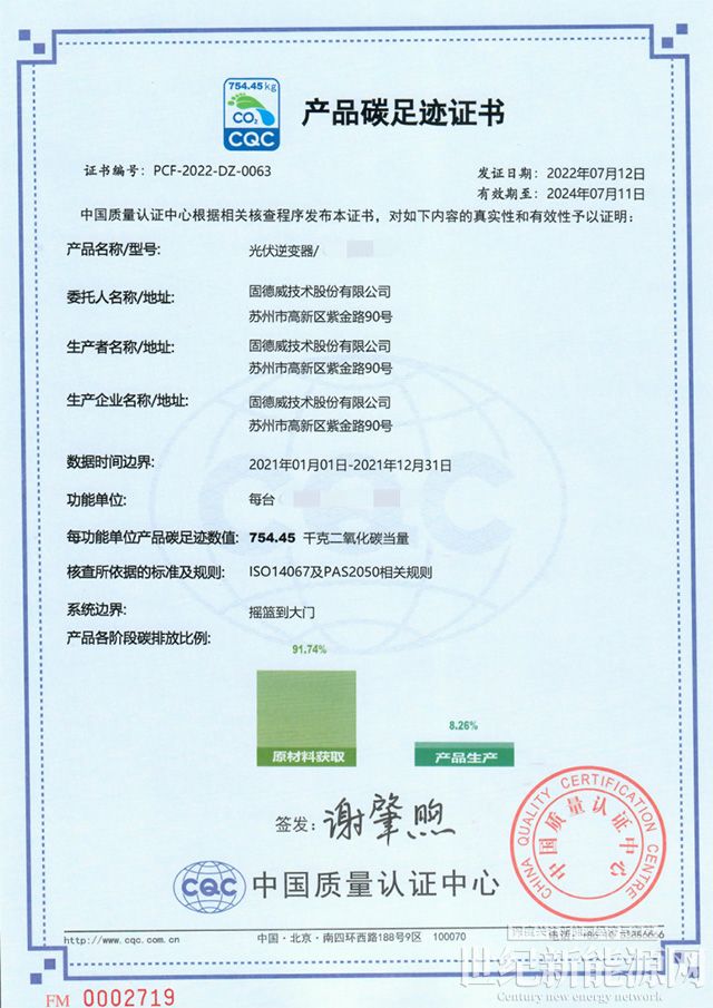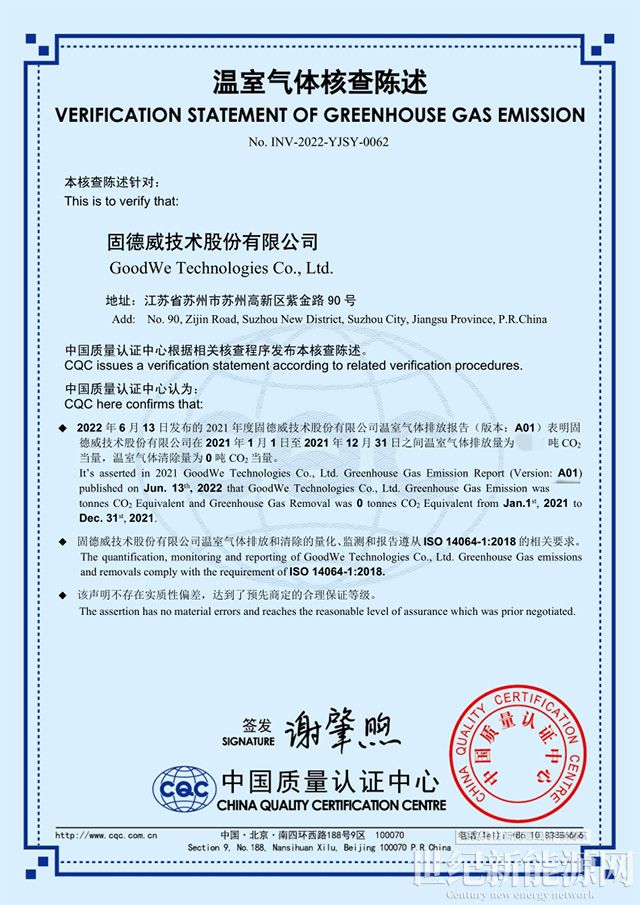 2022年7月,固德威獲得由中國(guó)質(zhì)量認(rèn)證中心的雙料認(rèn)證,對(duì)其頒發(fā)產(chǎn)品碳足跡認(rèn)證書(shū)及溫室氣體核查陳述認(rèn)證證書(shū),固德威不僅為客戶提供智慧零碳解決方案,其自身也在不斷踐行綠色發(fā)展理念,充分體現(xiàn)了固德威作為一家大企業(yè)在綠色時(shí)代中的決心和擔(dān)當(dāng)。