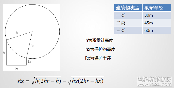 接閃桿一般選用直徑12-16mm的熱鍍鋅圓鋼,接閃端宜做成半球狀,最小彎曲半徑為4.8mm;避免陰影投射到光伏組件上接閃桿安裝在組件陣列的北側,家用項目可用光伏板金屬支架做接閃器。接閃桿的高度采用滾球法計算: