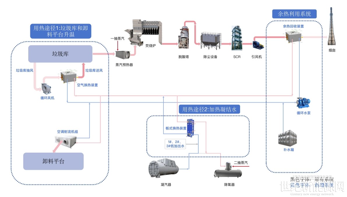 根據(jù)垃圾焚燒電廠的用熱需求,可將回收的余熱用于加熱凝結(jié)水,提高除氧器進水溫度,降低除氧器對蒸汽的消耗,可為企業(yè)節(jié)省大量的蒸汽,也可用于加熱焚燒爐一次風,提高焚燒爐的進風溫度,減少新蒸汽的消耗,節(jié)約的蒸汽可用于發(fā)電或供熱,提高企業(yè)的經(jīng)濟效益。另外,采暖季時,回收的余熱通過空氣換熱裝置可為垃圾庫升溫使用,提高垃圾庫環(huán)境溫度,減少垃圾發(fā)酵時間,提高垃圾處理效率。同時,回收的余熱可以通過射流機組供卸料平臺采暖使用或用于加熱鍋爐補水、供熱、洗浴、制冷等。