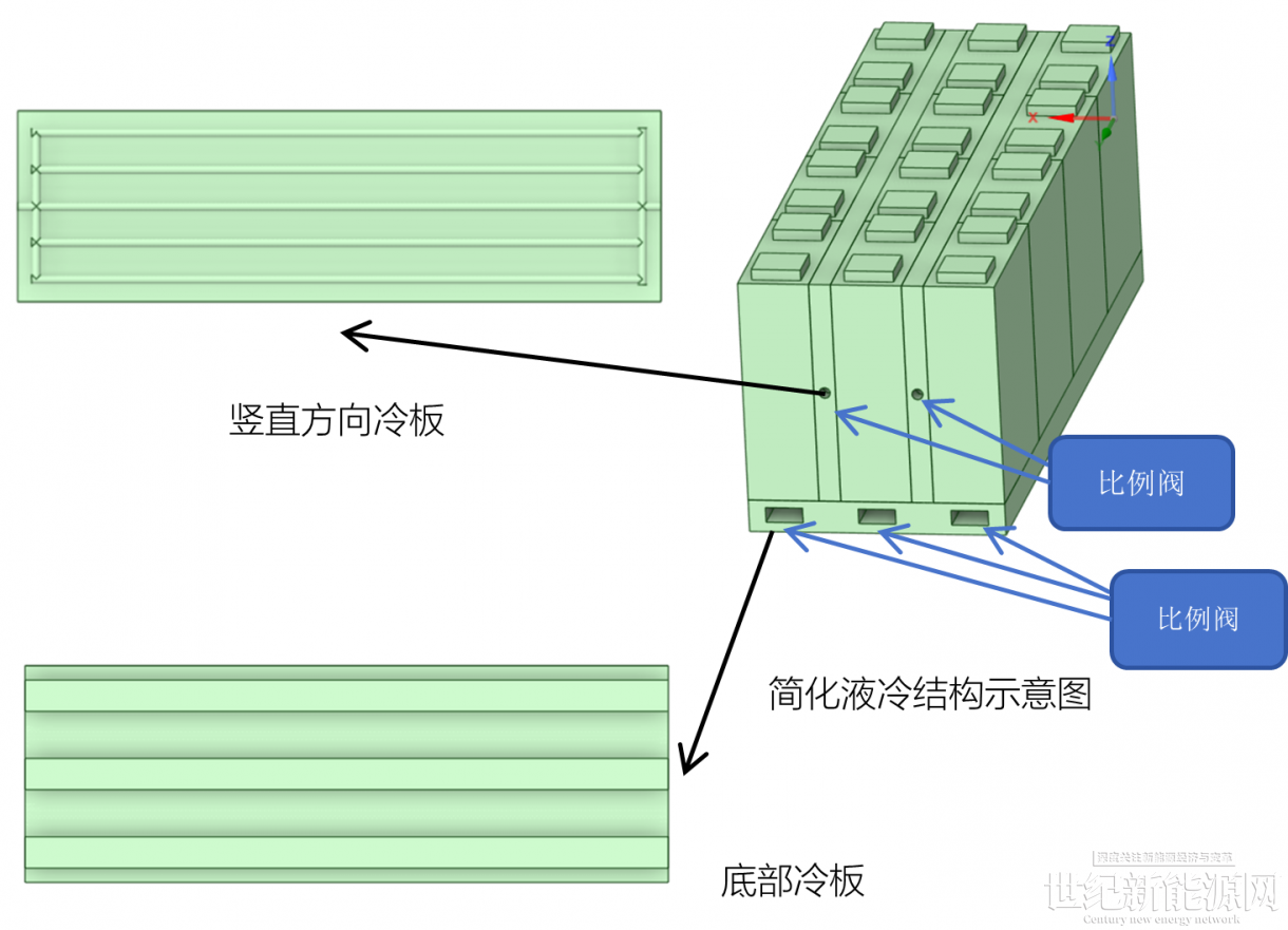 提出一種下置冷板與上置豎直冷板共同冷卻,板內流道之間相互獨立,以比例閥調配流量的液冷結構,如圖所示。