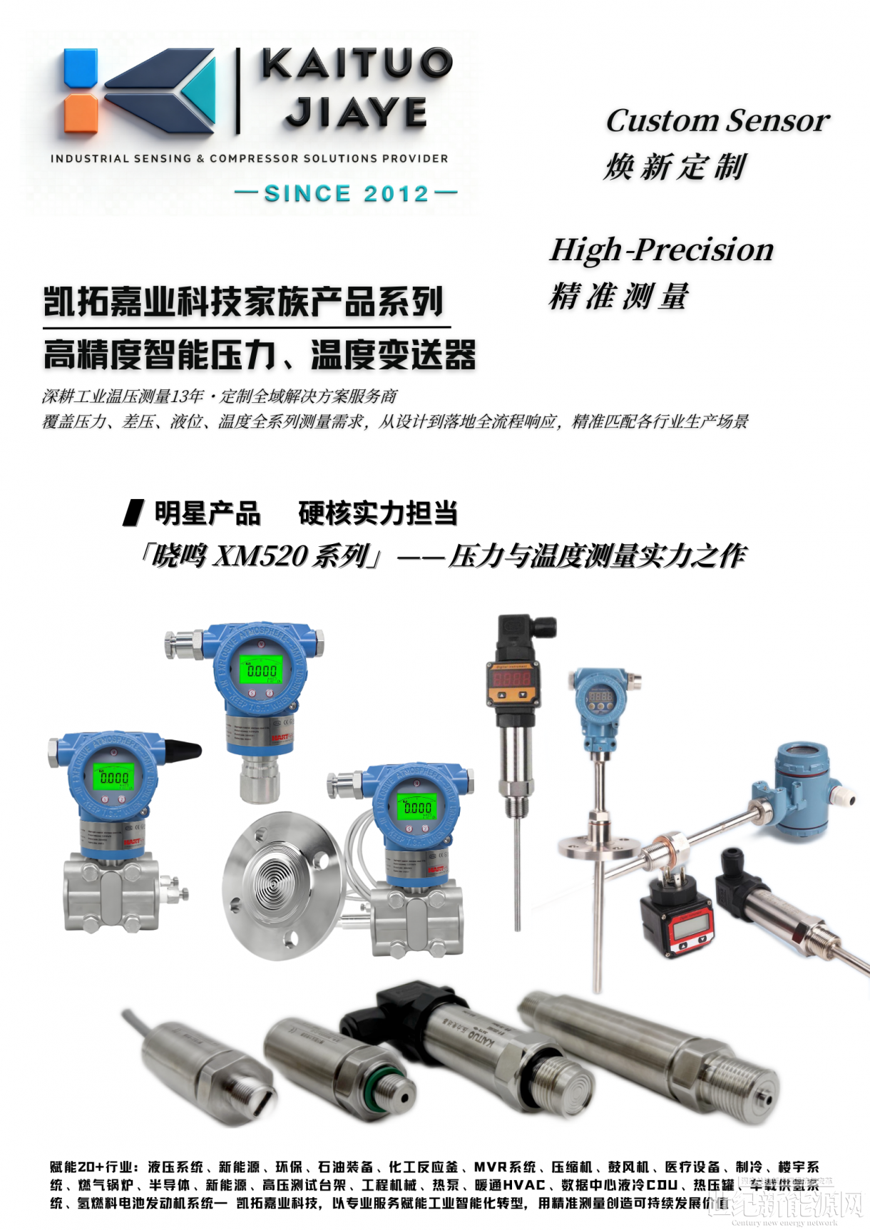 凱拓嘉業科技,深耕工業測量領域多年,以全域定制為核心導向,致力于成為壓力、差壓、液位、溫度測量解決方案的專業整合服務商。我們深耕全系列產品的定制化設計、高效落地與全周期服務,深度整合行業優質資源與技術,為國內外各行業客戶提供適配性強、穩定可靠的溫壓測量產品。旗下曉鳴 XM520 系列壓力與溫度產品,憑借務實創新技術,助力客戶從容應對各類工業測量場景挑戰,以專業實力賦能工業智能化升級,為客戶創造可持續價值。
