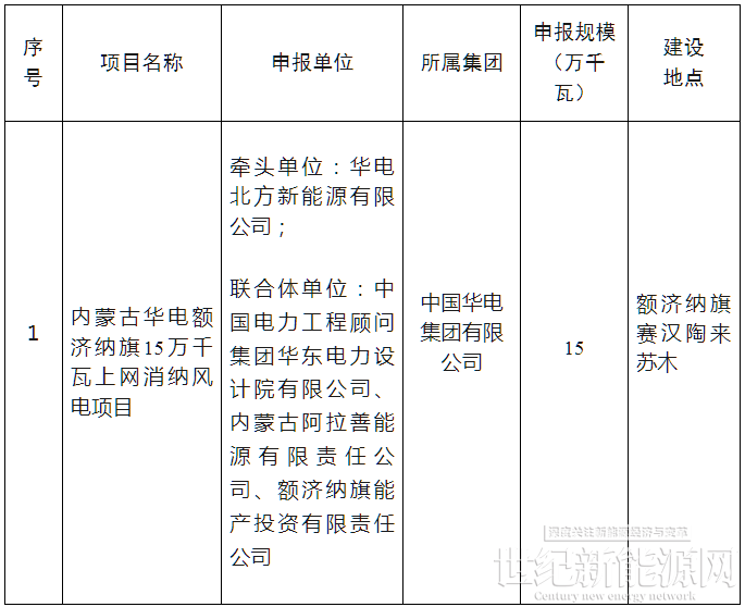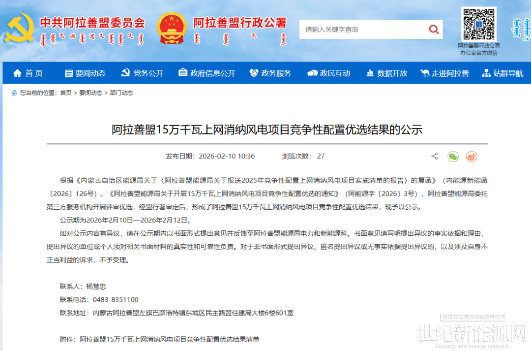 2月10日, 內蒙古阿拉善盟15萬千瓦上網消納風電項目競爭性配置優選結果公示。根據公示,牽頭單位為華電北方新能源有限公司。聯合體單位:中國電力工程顧問集團華東電力設計院有限公司、內蒙古阿拉善能源有限責任公司、額濟納旗能產投資有限責任公司。