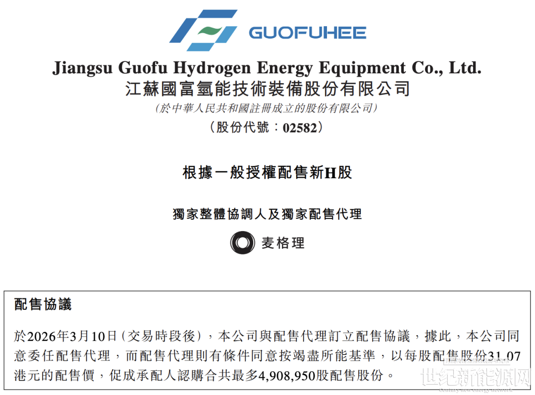 3月11日,國富氫能發(fā)布公告,于2026年3月10日,公司與配售代理訂立配售協(xié)議,公司同意委任配售代理以每股配售股份31.07港元的配售價(jià),促成承配人認(rèn)購合共最多490.895萬股配售股份。配售股份數(shù)目分別占經(jīng)根據(jù)配售事項(xiàng)發(fā)行的配售股份所擴(kuò)大的已發(fā)行H股總數(shù)及已發(fā)行股份總數(shù)約4.84%及3.88%。配售價(jià)較于配售協(xié)議日期在聯(lián)交所所報(bào)每股股份收市價(jià)35.42港元折讓約12.28%。
