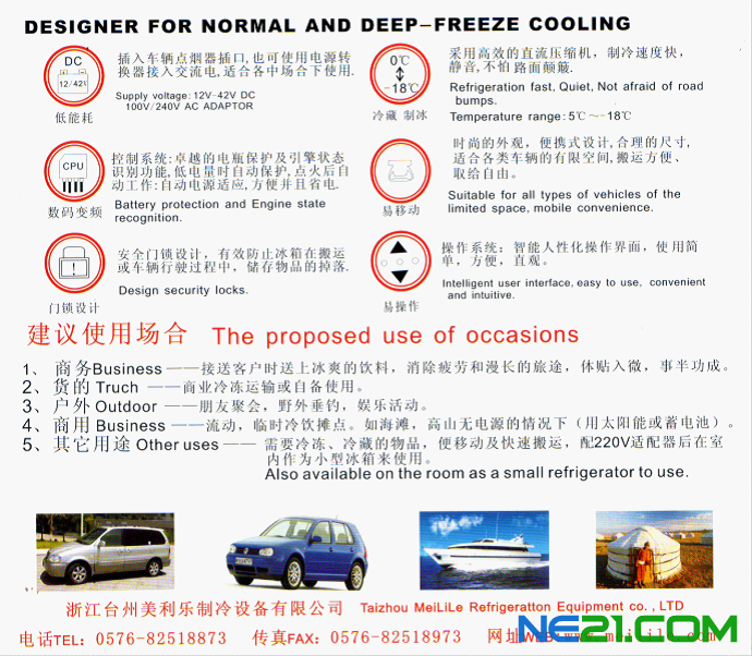 5、其它用途 Other uses —— 需要冷凍、冷藏的物品,便移動及快速搬運,配220V適配器后在室 內作為小型冰箱來使用。