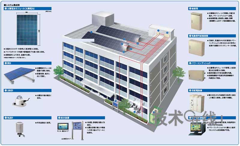 上圖為采用208系列的系統構成范例。太陽能電池模塊、光能計及氣溫計等設置在大樓等的房頂上。太陽能電池模塊提供的電力通過接線盒集中之后,傳送到功率調節器,在此進行直流電到交流電的轉換。然后傳輸至大樓配備的受變電設備供用戶使用。