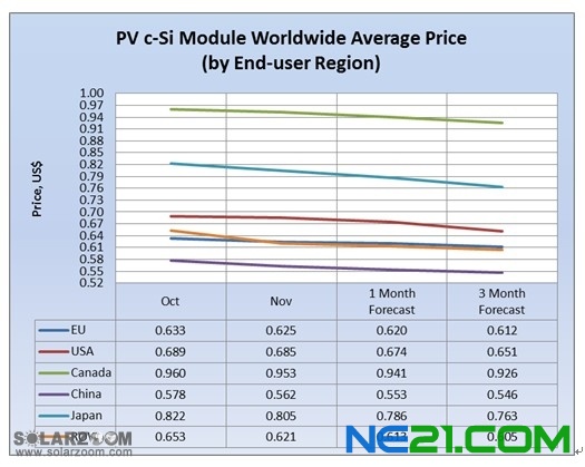 12月至明年2月期間,價格可能略有下降。2013年2月末,預計中國輸往歐洲市場的平均晶體硅組件價格僅下降約2%,更多價格下降壓力可能集中在ROW地區。11月至2013年初,預計價格跌幅介于 2%至5%之間。