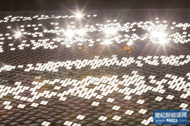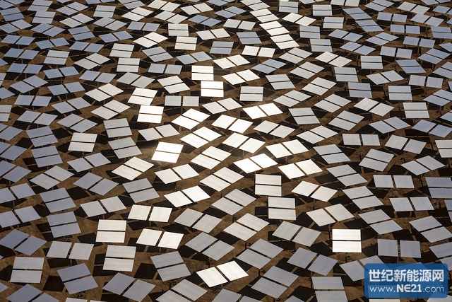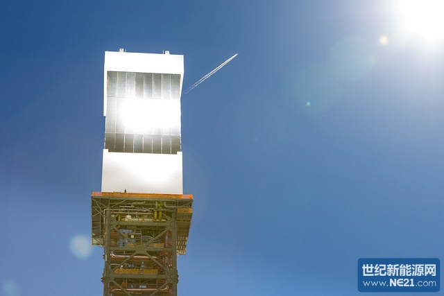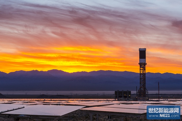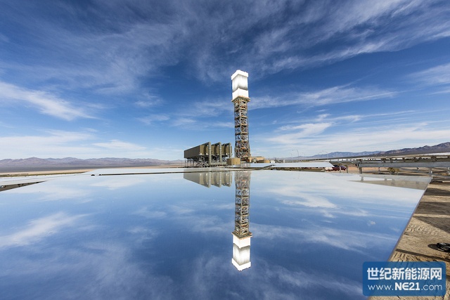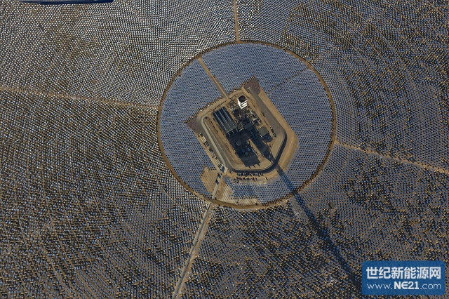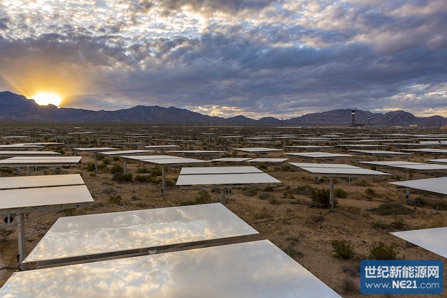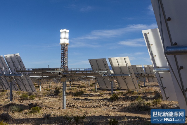 這座太陽能牧場座落在南加州Mojave 沙漠中,占地5.5 平方英哩、稱為中央集光塔的中央高塔高度為459 英呎;透過30 萬片定日鏡(heliostat)玻璃隨著太陽移動跟著變換角度,將光線(能量)集中到中央集光塔的頂端,塔頂的熱吸收器被加熱到??極高溫,便會啟動熱交換機和鍋爐產生蒸氣來驅動發電機。這座目前世界上最大的太陽能電廠,發電量可應付14 萬個家庭使用,相當于美國30% 總太陽能發電量。