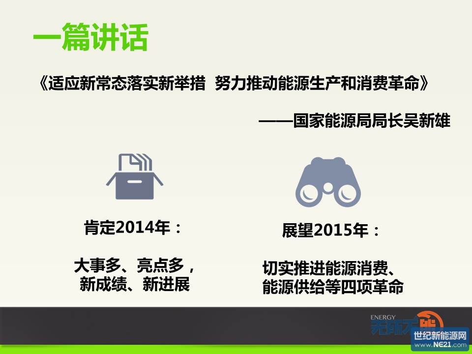 國家發展改革委主任徐紹史出席會議并作重要講話,國家能源局局長吳新雄在會上作題為“適應新常態落實新舉措努力推動能源生產和消費革命”的報告。想知道2014中國能源發展總體情況如何?2015的能源革命大方向又將如何?一張圖就夠了↓↓↓