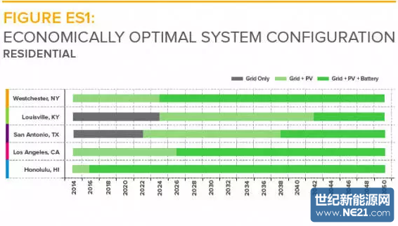 運用HOMER Energy的建模軟件以及美國能源信息署的數據,新報告對單純依靠電網、電網+光伏、電網+光伏+儲能3種模式進行了模擬,根據系統的均化發電成本,確定一定時期內成本最低的技術選擇。