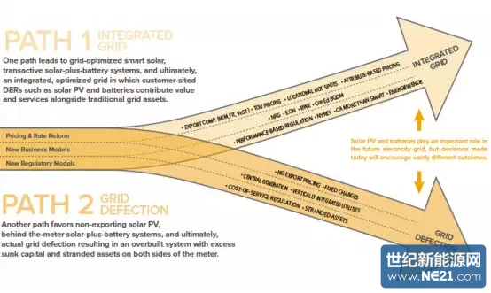 在“脫網”真正到來前,公用事業和監管者會尋求協調其經濟上的壟斷優勢。RMI報告指出,它們面臨的是“隱喻性的岔路”,一方面可能分布式戶用能源與集中式電網供電和諧共生,另一方面也可能公用事業公司和用戶在相互阻撓和對抗中,將大把的投資浪費在無用的系統上。