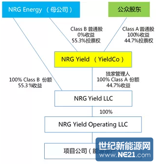 其次,母公司創設NRG Yield(YieldCO)并在紐交所公開上市融資。完成后公眾股東持有A類普通股,享有YieldCO的100%收益(economic interest)和44.7%投票權;母公司則持有B類普通股,不享有YieldCO收益但享有55.3%投票權。